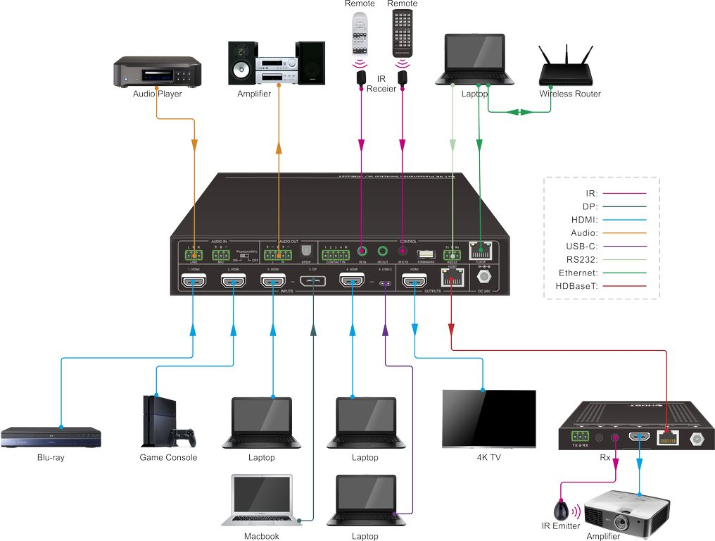 Для интеграции в управляющие комплексы предусмотрены интерфейсы RS-232 и TCP/IP с графическим интерфейсом управления. Бесподрывное переключение особенно важно там, где недопустимы паузы, затемнение экрана или потеря синхронизации при смене источника. В комплект поставки входит HDBT-приемник, благодаря чему устройство можно быстрее внедрить в готовую систему без подбора совместимого удаленного модуля.