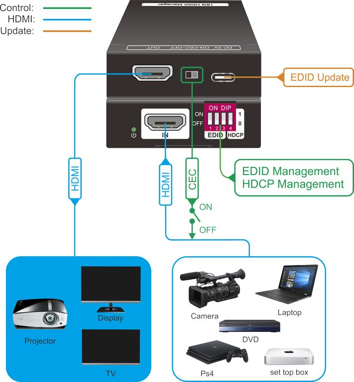 Digis EX-HDCP — специализированный HDMI-конвертер для управления EDID и HDCP, который помогает согласовать источник сигнала и устройство отображения в сложных AV-инсталляциях. Модель рассчитана на работу в трактах, где важно обеспечить корректное распознавание подключенного дисплея и повысить совместимость оборудования разных классов. Устройство поддерживает передачу сигнала с разрешением до 4K 60 Гц 4:4:4 при пропускной способности до 18 Гбит/с, поэтому подходит для современных HDMI 2.0-систем.