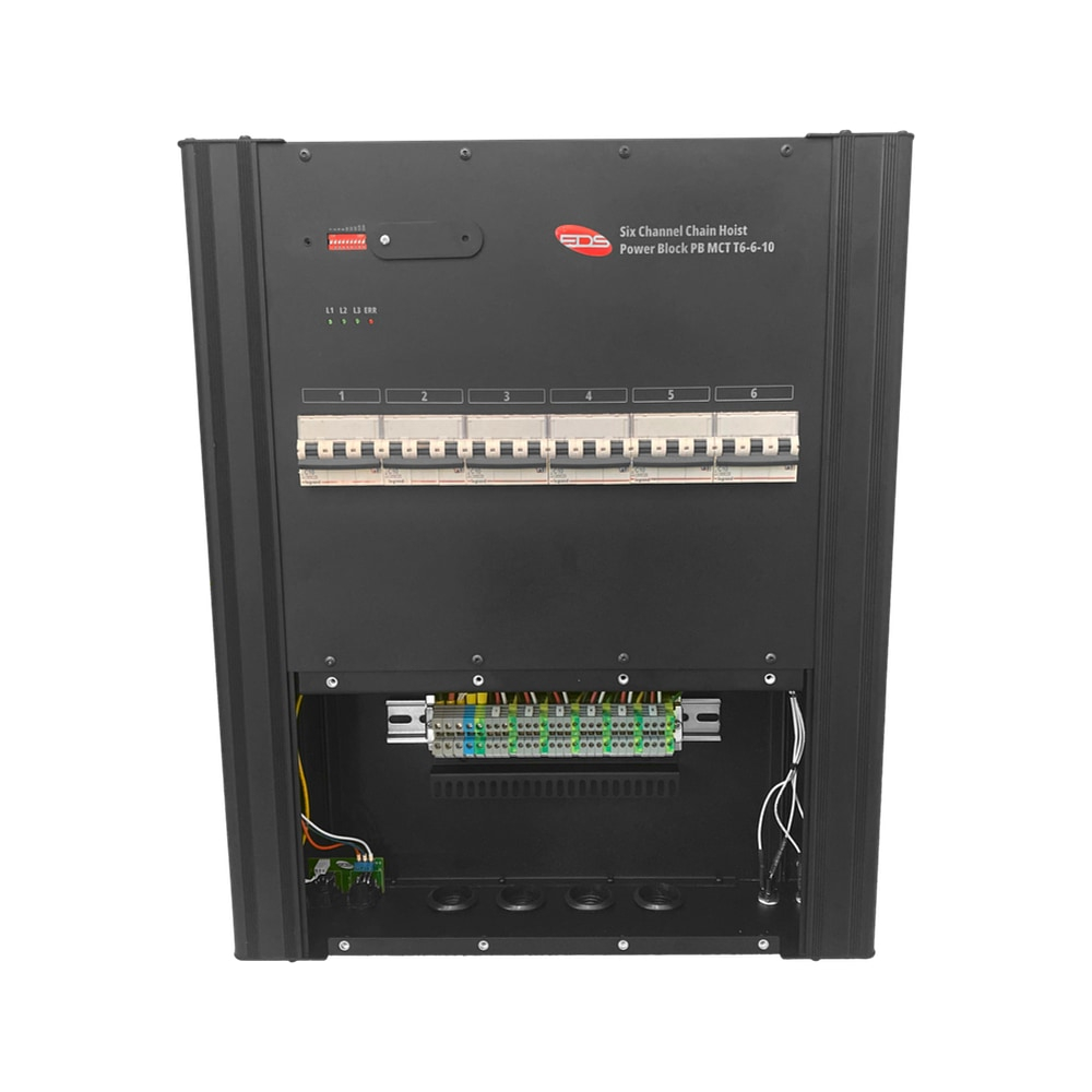EDS PB MCT T6-6-10 — настенный блок управления цепными лебёдками, рассчитанный на 6 каналов и предназначенный для аккуратного распределения питания и реверса направления подъёма.
