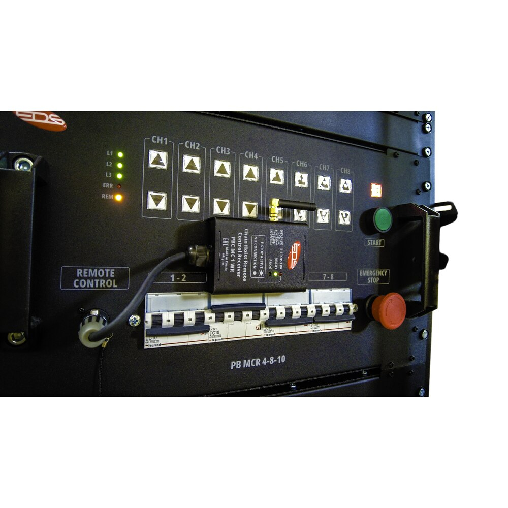 EDS PBC MC 1 WRS — это приёмник радиосигнала для построения беспроводного управления мотор-контроллерами через пульты серии PBC MCT WT. Устройство принимает команды с передатчика и передаёт их в систему управления лебёдками, позволяя вынести оператора из опасной зоны и упростить работу на площадке.