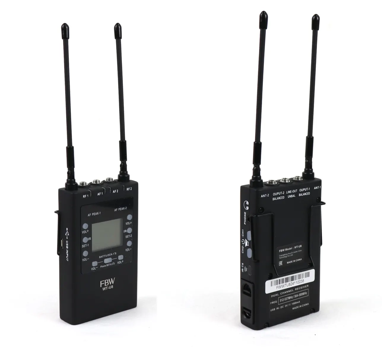 FBW WT-U8+2KT-60 — двухканальная накамерная радиосистема, рассчитанная на запись речи и комментариев сразу с двух источников звука. В комплект входят компактный приёмник WT-U8, два поясных передатчика KT-60 и два петличных микрофона, поэтому система подходит для интервью, видеосъёмки, репортажей и мобильного продакшна. Форм-фактор с креплением приёмника на камеру делает комплект удобным для работы в полевых условиях и на выездных съёмках.