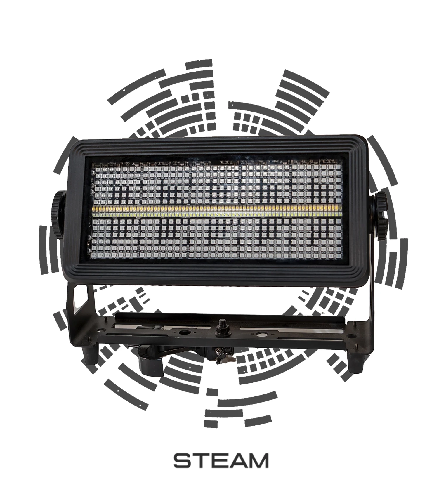 SHADOW STEAM 1000 IP — мощный светодиодный стробоскоп с источниками RGB+CW для концертных, клубных, фестивальных и шоу-инсталляций. Прибор объединяет 420 RGB-светодиодов по 1,5 Вт и 140 холодных белых светодиодов по 5 Вт, что позволяет создавать яркие строб-импульсы, цветовые вспышки, широкую заливку и динамические световые эффекты.