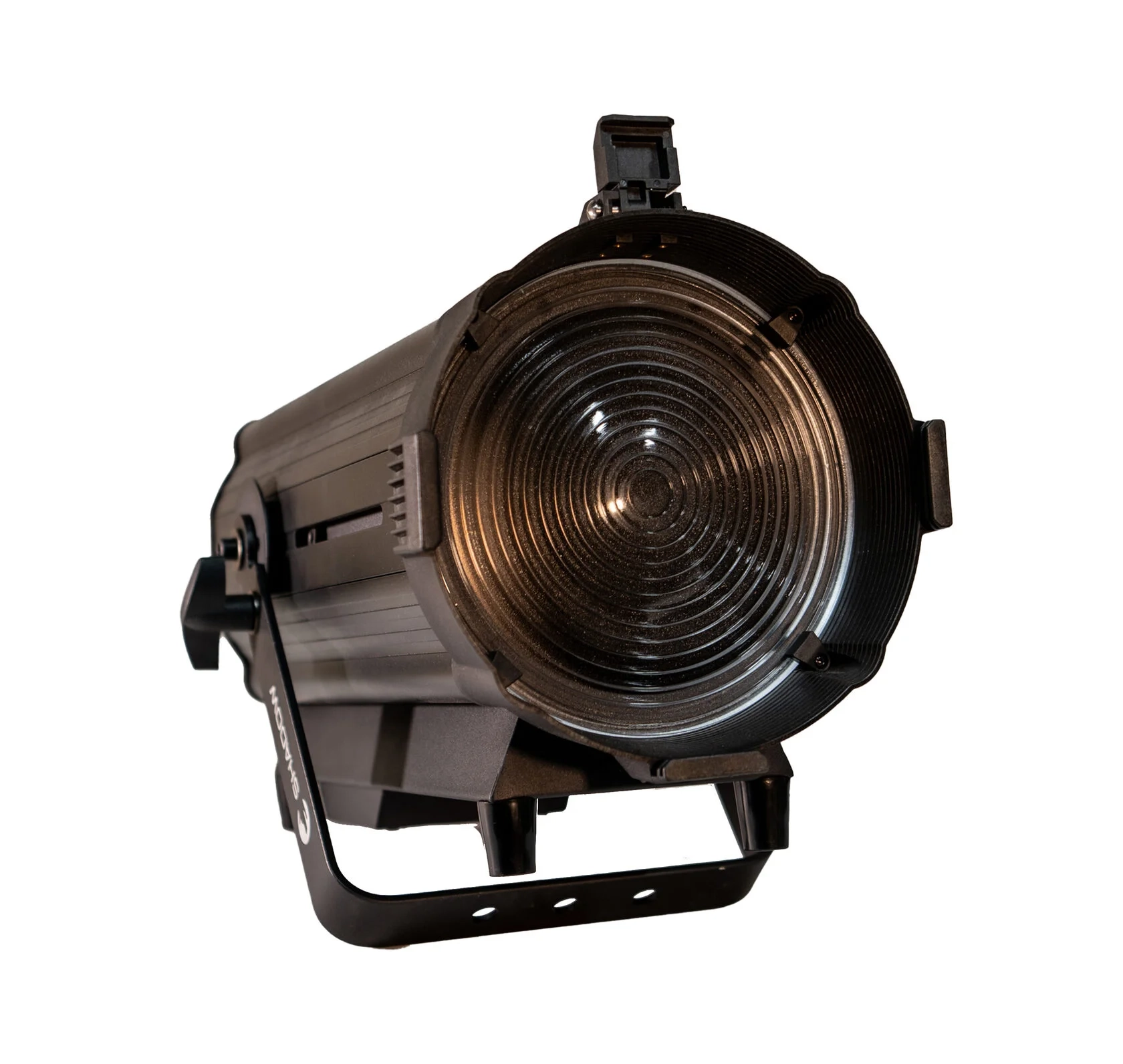 Моторизованный зум 8°–90° позволяет дистанционно менять угол раскрытия луча от узкого акцентного света до широкой равномерной заливки. Зуммирование выполняется за счет смещения источника света относительно линзы, что характерно для френелевской оптической схемы и помогает гибко адаптировать световой поток под разные расстояния и размеры площадки.