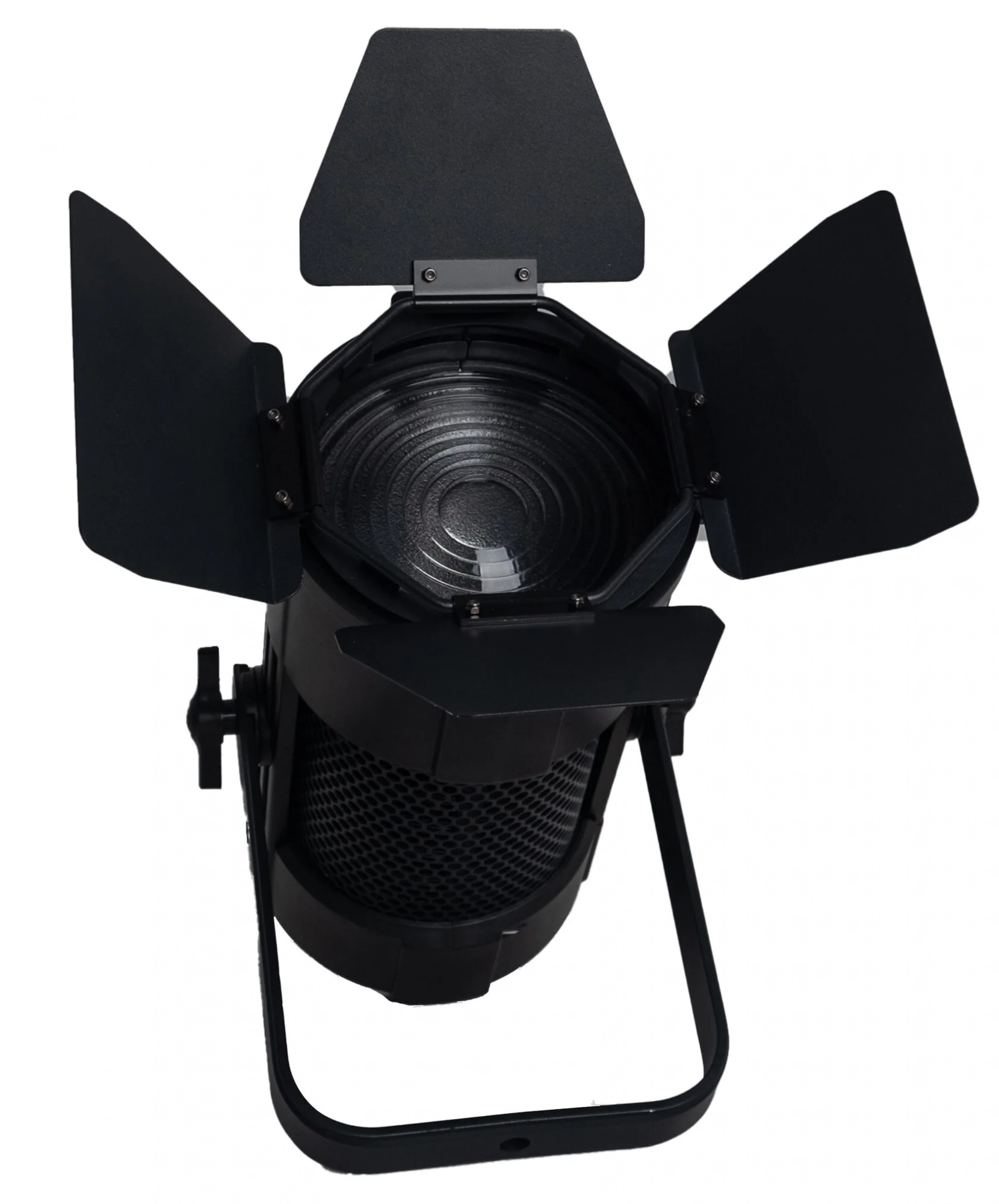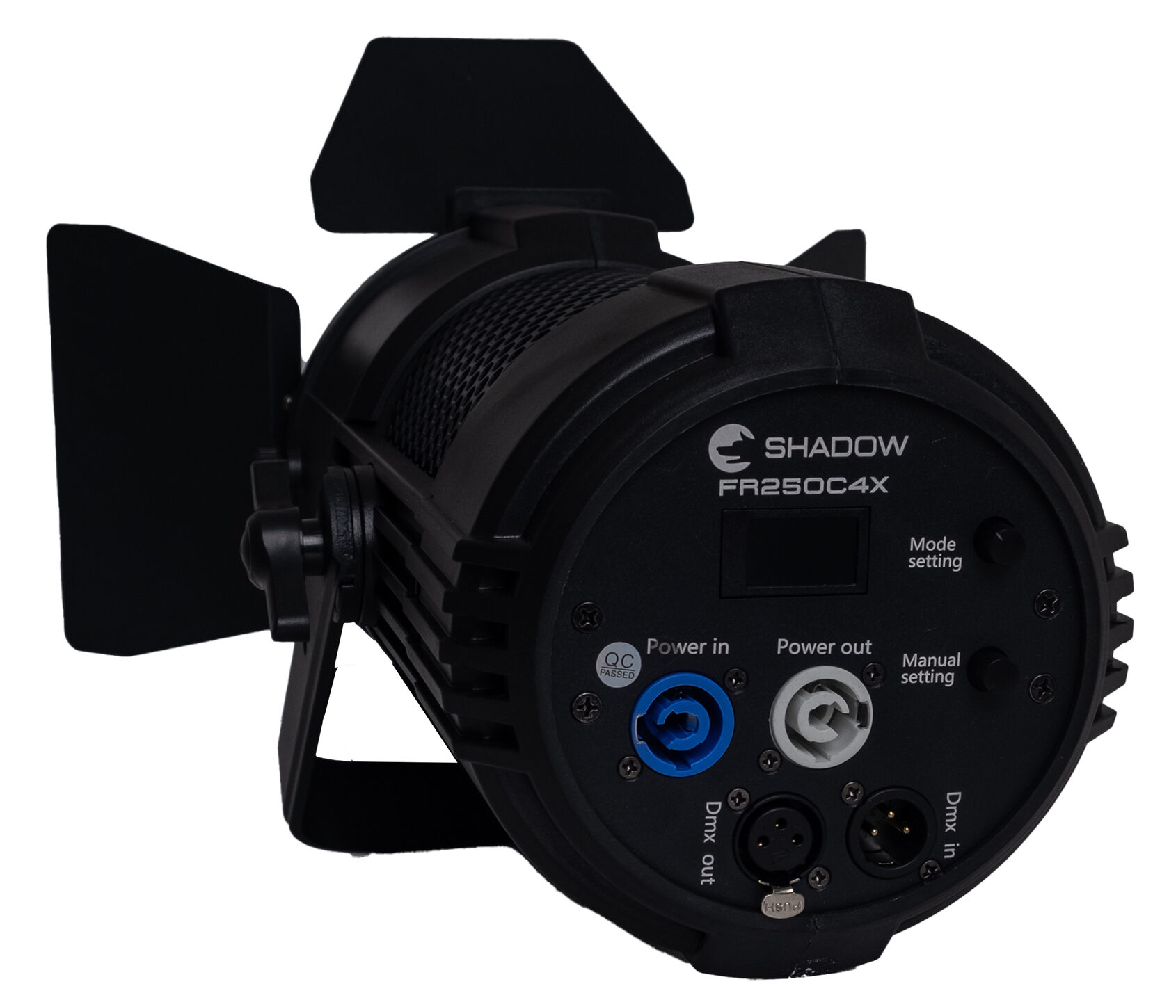 SHADOW Fresnel FR250C4X — светодиодный прожектор с линзой Френеля и RGBW COB-источником мощностью 200 Вт. Прибор предназначен для сценического, театрального, студийного и инсталляционного освещения, где требуется мягкий управляемый свет с возможностью цветовой заливки и настройки белого тона.