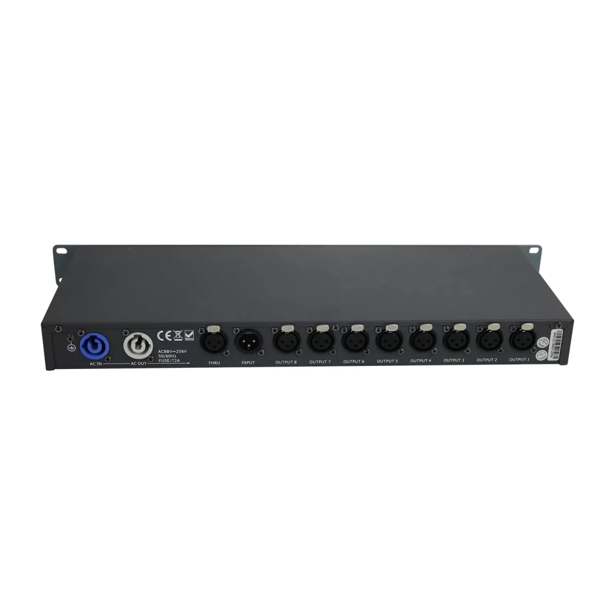 VSHOW SPL8V RDM — рэковый DMX-сплиттер/разветвитель, рассчитанный на стабильное распределение сигнала в световых инсталляциях, на сцене и в прокатных комплектах. Модель поддерживает RDM, поэтому подходит не только для раздачи DMX512, но и для обратной связи с совместимыми приборами при настройке и обслуживании системы. По данным производителя, устройство оснащено 2 входами и 8 выходами, что удобно для разветвления одной линии управления на несколько независимых направлений.