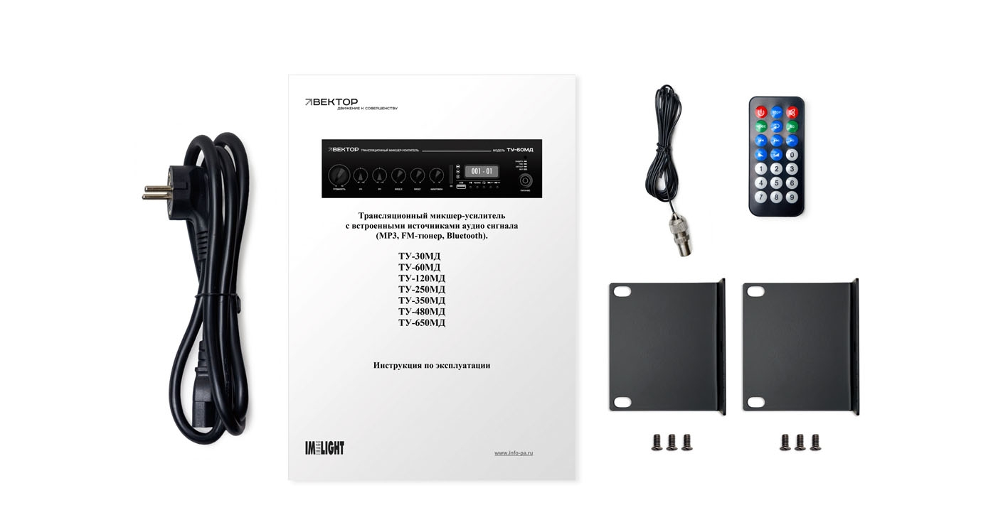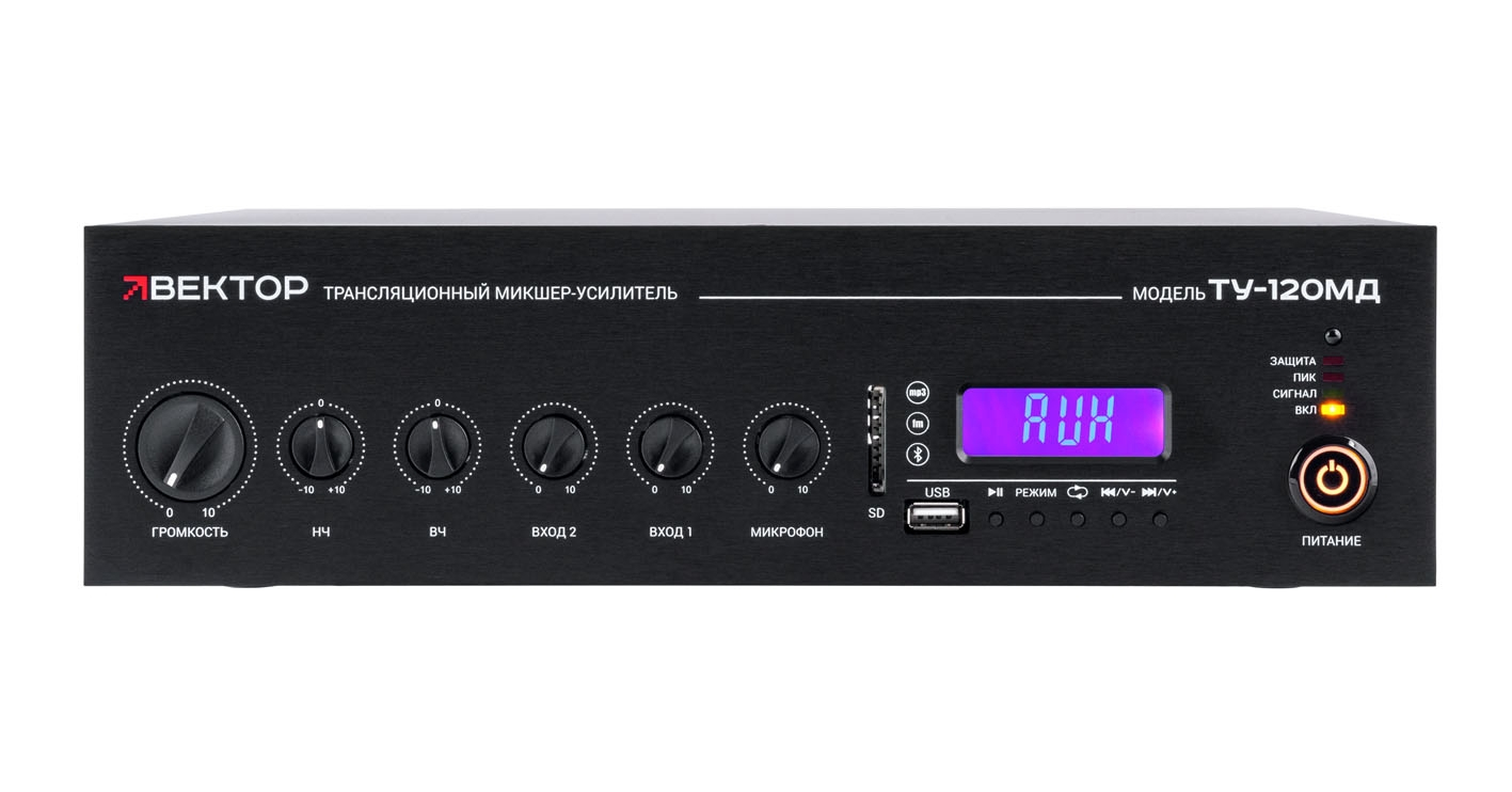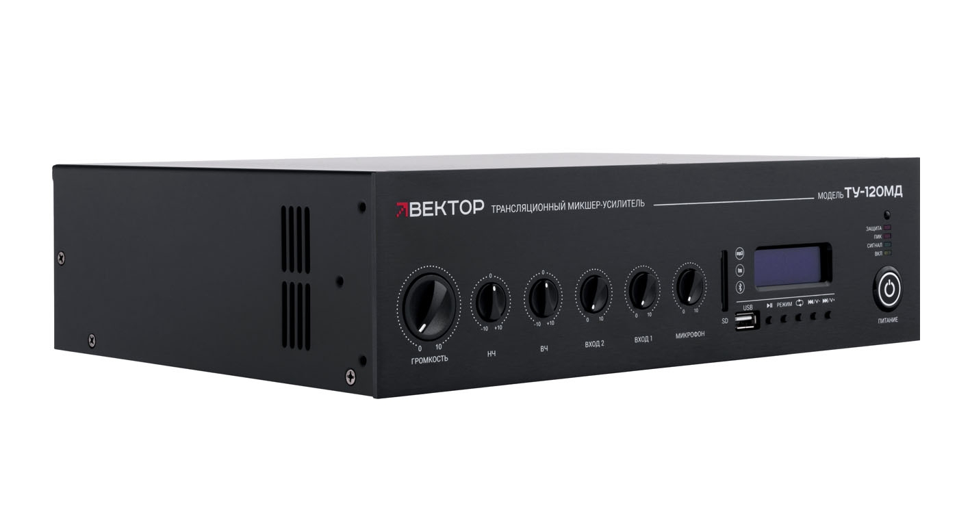 ВЕКТОР ТУ-120МД (V2) — трансляционный микшер-усилитель класса D мощностью 120 Вт со встроенными источниками аудиосигнала, рассчитанный на фоновое озвучивание и передачу речевых сообщений в магазинах, офисах, кафе, учебных аудиториях и других коммерческих помещениях. Модель работает как с трансляционными линиями 100 В, так и с низкоомной акустикой 4–16 Ом, поэтому подходит для типовых систем оповещения и музыкальной трансляции. По функциональности это универсальное решение для объектов, где важно совместить усилитель, микшер и встроенный аудиоплеер в одном корпусе.
