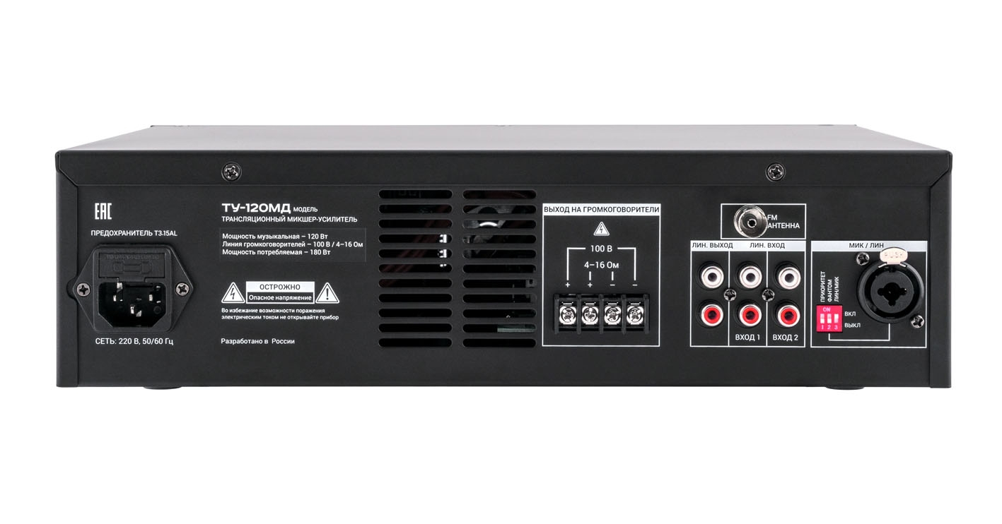 ВЕКТОР ТУ-120МД — трансляционный микшер-усилитель класса D мощностью 120 Вт со встроенными источниками аудиосигнала, рассчитанный на фоновое озвучивание и передачу речевых сообщений в магазинах, офисах, кафе, учебных аудиториях и других коммерческих помещениях. Модель работает с трансляционными линиями 100 В и низкоомной акустикой 4–16 Ом, поэтому подходит как для стандартных систем оповещения, так и для локальных музыкальных инсталляций. Встроенный медиамодуль позволяет использовать усилитель не только с внешними источниками, но и как самостоятельный центр воспроизведения аудио.