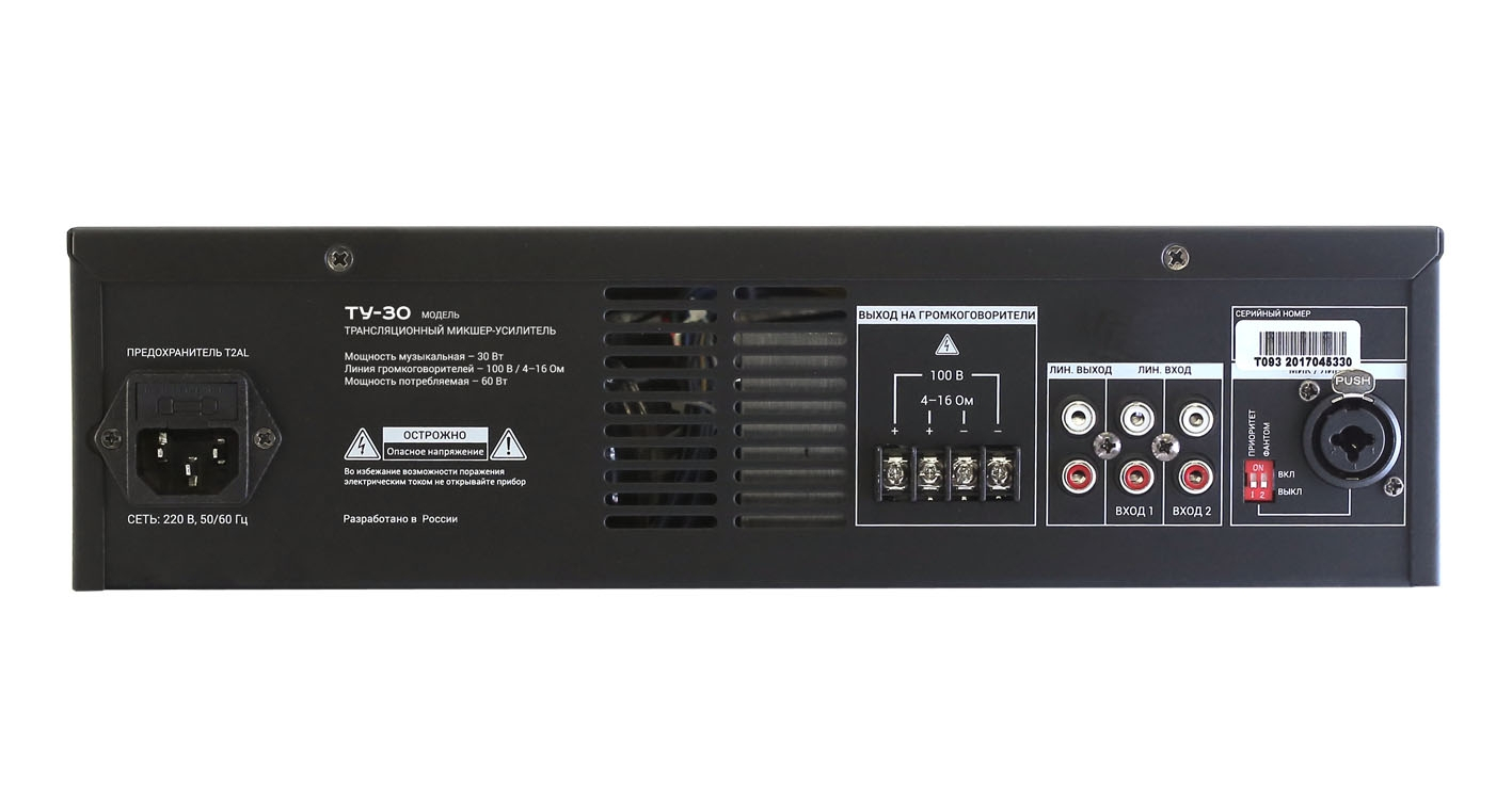На передней панели расположены мастер-громкость, двухполосный эквалайзер и светодиодная индикация питания, сигнала, перегрузки и защиты. Для микрофонного канала доступны приоритет и фантомное питание, а встроенная защита от перегрева и короткого замыкания повышает надёжность при ежедневной эксплуатации. В результате ТУ-30 (V2) хорошо подходит для небольших систем оповещения, где важны простое управление, стабильная работа и совместимость с распространённой трансляционной акустикой.