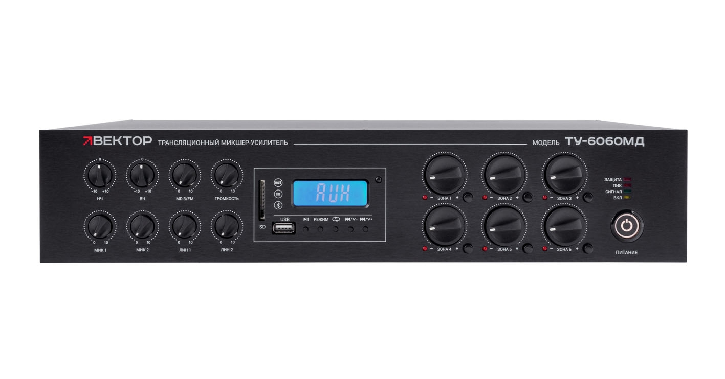 ВЕКТОР ТУ-6060МД — шестизональный трансляционный микшер-усилитель класса D мощностью 60 Вт, предназначенный для систем музыкальной трансляции и речевого оповещения на объектах с несколькими независимыми зонами. Модель хорошо подходит для магазинов, офисов, кафе, учебных учреждений и административных помещений, где требуется централизованная подача сигнала с возможностью распределения звука по отдельным линиям.
