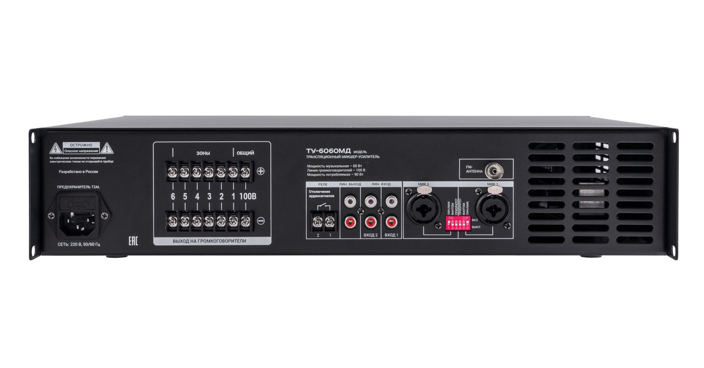 Одной из ключевых особенностей ТУ-6060МД является поддержка 6 зон вещания, благодаря чему можно гибко организовать озвучивание разных помещений в рамках одной системы. Для расширения инсталляции предусмотрен линейный выход на дополнительный усилитель, а также функция принудительного отключения вещания по сухому контакту. На лицевой панели расположены регуляторы громкости, кнопки управления встроенным плеером и органы контроля работы устройства, а встроенные защиты от короткого замыкания, перегрева и перегрузки повышают надёжность при постоянной эксплуатации. По своему функционалу эта модель является практичным решением для многозонных систем оповещения, где важны простота управления, наличие встроенного источника сигнала и стабильная ежедневная работа.