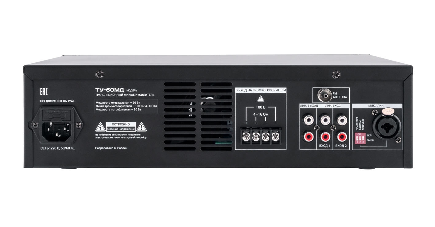 На передней панели доступны раздельные регулировки уровней, мастер-громкость, двухполосный эквалайзер и управление встроенным плеером, благодаря чему устройство удобно в повседневной эксплуатации. Для универсального входа предусмотрены приоритет и фантомное питание, а встроенная защита от перегрева и короткого замыкания повышает надёжность при постоянной работе. В открытой официальной документации модель указана как ТУ-60МД серии ТУ-МД; обозначение «V2» встречается в карточках товара и каталогах, при этом основные технические параметры соответствуют данным производителя для ТУ-60МД.