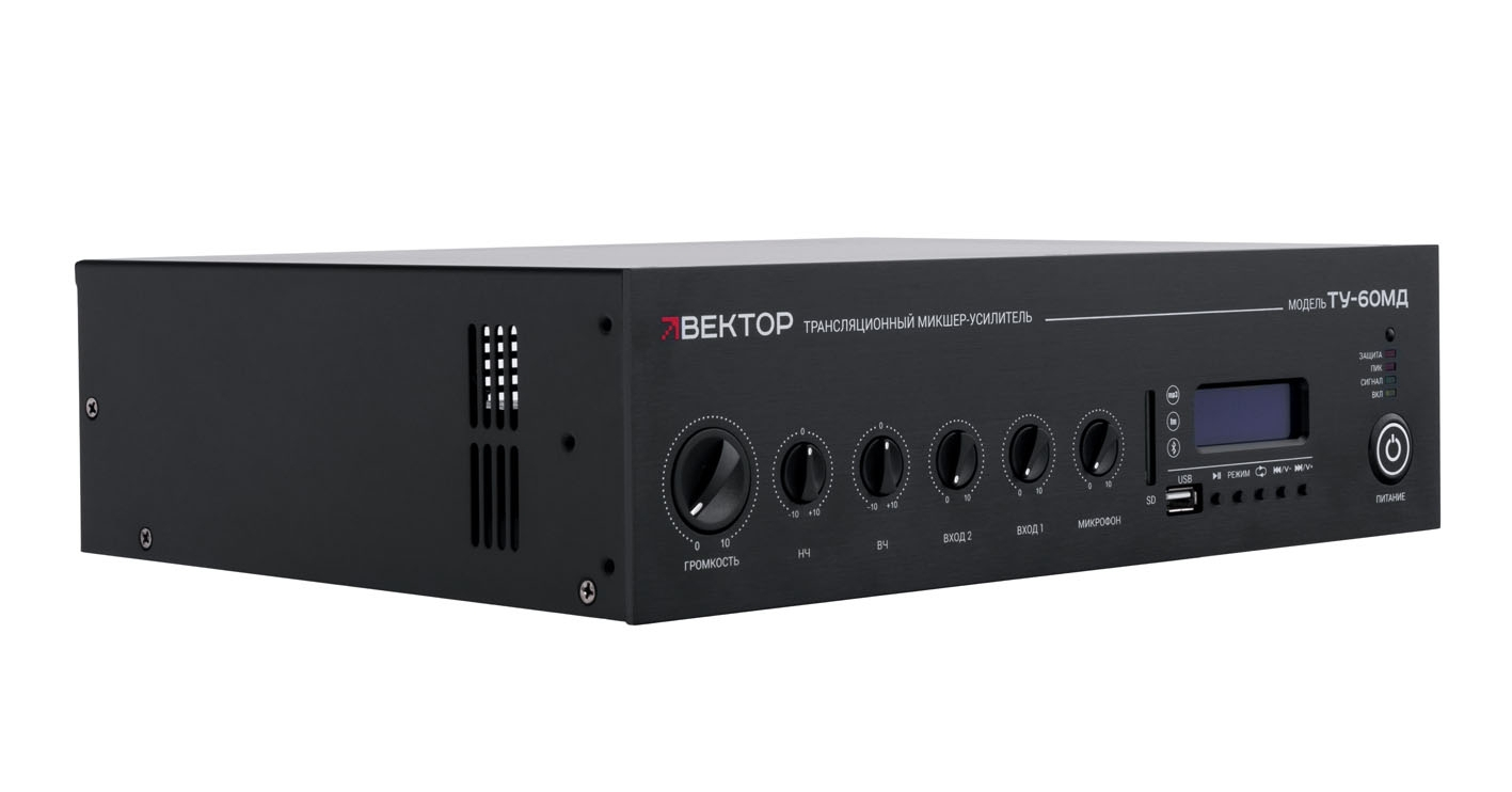 ВЕКТОР ТУ-60МД (V2) — трансляционный микшер-усилитель класса D мощностью 60 Вт со встроенными источниками сигнала, рассчитанный на фоновое озвучивание и голосовые объявления в магазинах, офисах, кафе, учебных аудиториях и других небольших объектах. Модель работает как с трансляционными линиями 100 В, так и с низкоомной акустикой 4–16 Ом, поэтому подходит для типовых систем оповещения и музыкальной трансляции.