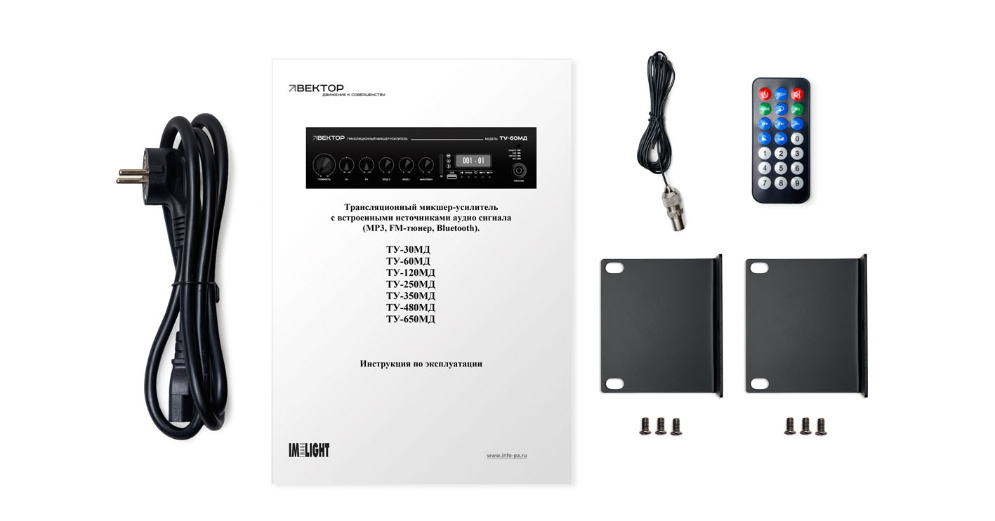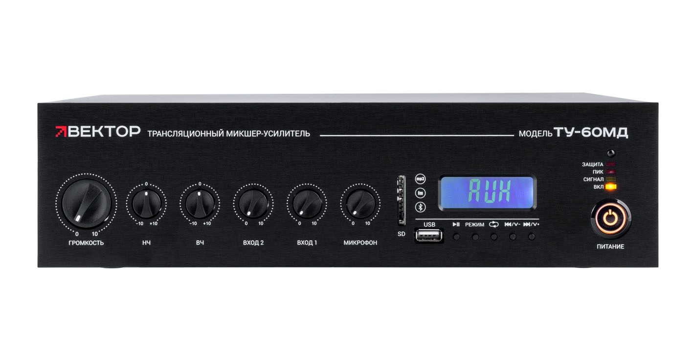 ВЕКТОР ТУ-60МД — трансляционный микшер-усилитель класса D мощностью 60 Вт со встроенными источниками аудиосигнала, рассчитанный на системы фонового озвучивания и речевого оповещения в магазинах, офисах, кафе, учебных аудиториях и других небольших объектах. Модель поддерживает работу как с трансляционными линиями 100 В, так и с низкоомной акустикой 4–16 Ом, поэтому подходит для разных вариантов инсталляции. Усилитель ориентирован на повседневную эксплуатацию там, где важны компактность, простота подключения и наличие встроенного музыкального источника.