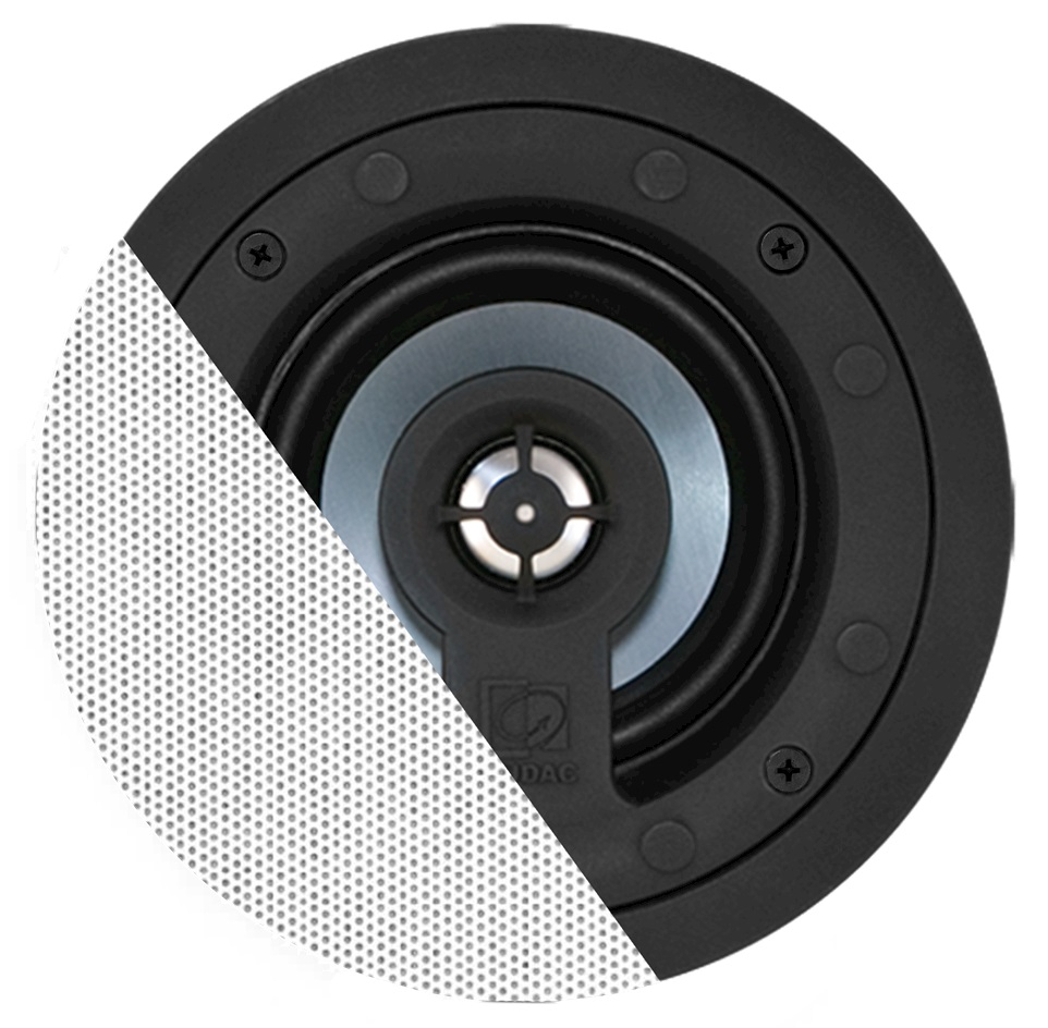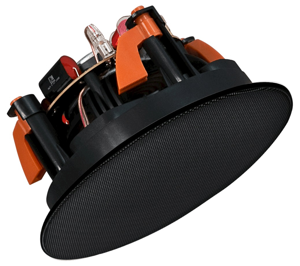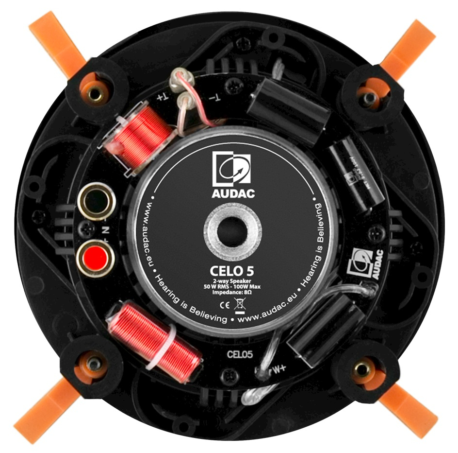 Отдельное преимущество AUDAC CELO5I/W — инсталляционная часть. Тонкая решётка SlimLine с рамкой всего 1 мм и выступом над поверхностью потолка около 3,2 мм делает громкоговоритель визуально почти незаметным после установки. Решётка крепится на неодимовых магнитах, а для подключения используются позолоченные пружинные клеммы Gold-Con, что упрощает монтаж и делает модель особенно удачной для интерьерных проектов, где важны и звук, и внешний вид