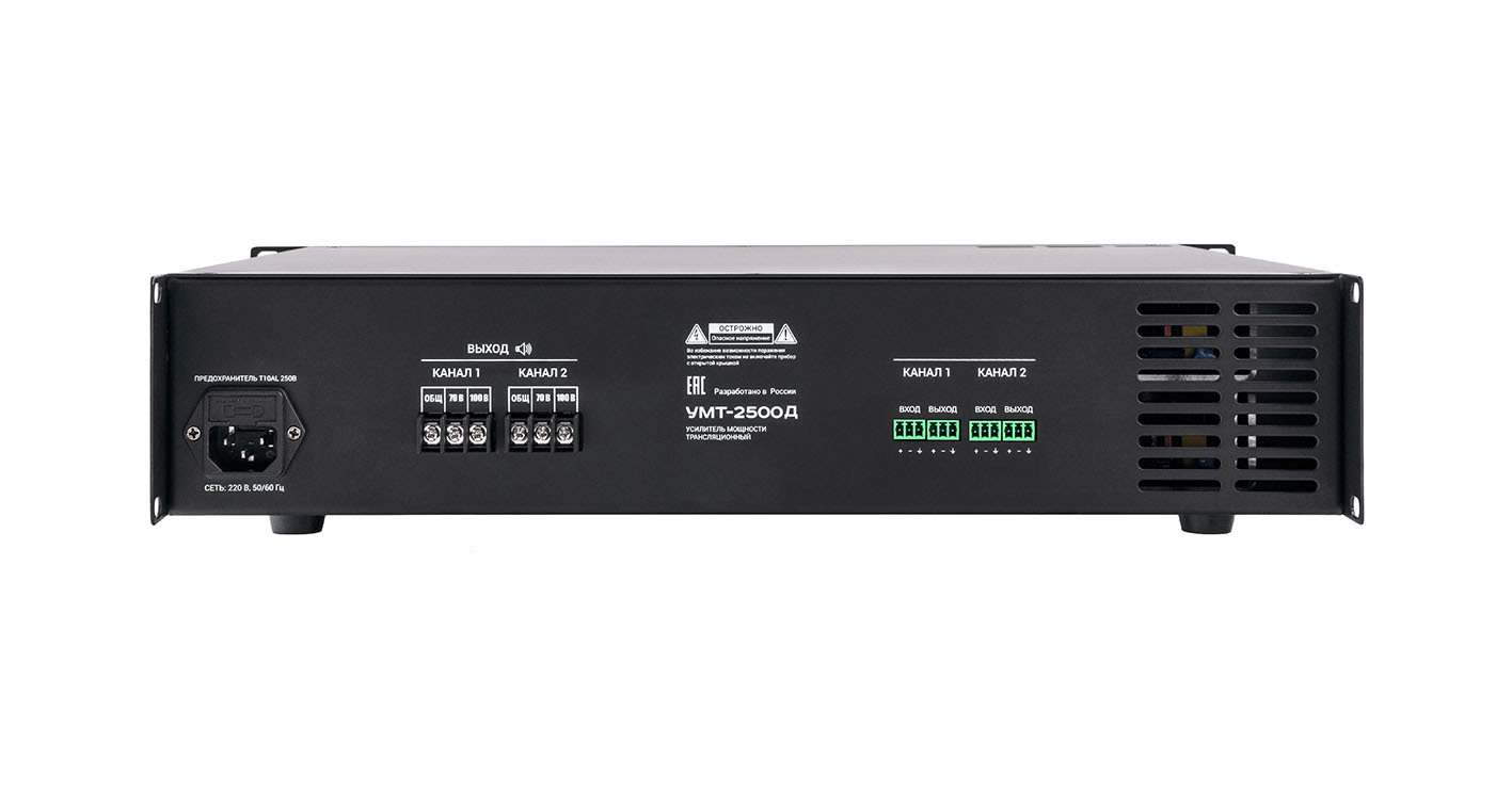 ВЕКТОР УМТ-2500Д — двухканальный трансляционный усилитель мощности класса D, предназначенный для систем музыкально-речевой трансляции, фонового озвучивания и аварийного оповещения. Модель работает с двумя независимыми каналами и рассчитана на подключение трансляционных линий 70 В и 100 В, что делает ее удобной для распределенных инсталляций на объектах различного масштаба. Усилитель логично использовать там, где требуется стабильная работа в составе профессиональной системы оповещения с несколькими зонами и централизованной архитектурой.