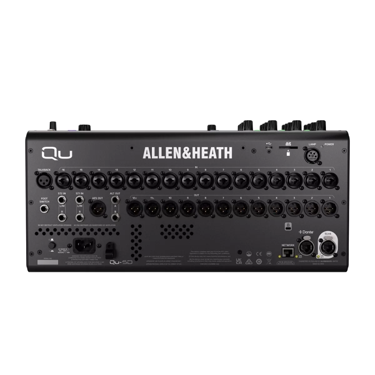 Allen & Heath Qu-5D — компактный цифровой микшер нового поколения, рассчитанный на живой звук, инсталляции, корпоративные площадки и мобильные комплекты, где важны высокая плотность функций и удобное управление. Модель работает на 96 кГц XCVI Core, поддерживает DEEP Processing и предлагает архитектуру 38 входов / 24 выходов, что делает ее универсальным решением для концертов, речи и многоканальной записи. Версия Qu-5D отличается встроенным интерфейсом Dante 16×16 с выделенным locking EtherCon-портом, поэтому пульт легко интегрируется в современную сетевую аудиосистему без внешних карт расширения.