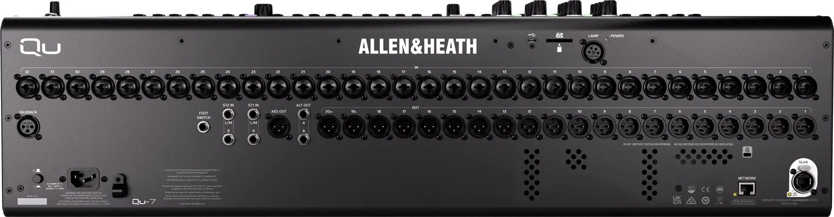 Пульт оснащён 33 моторизованными фейдерами по 100 мм, 32 локальными микрофонно-линейными входами на комбинированных разъёмах XLR/TRS и 20 аналоговыми XLR-выходами. Для записи и воспроизведения предусмотрены USB-C аудиоинтерфейс 32×32, многоканальная запись на SD-карту и стереозапись через USB-A, поэтому QU-7D одинаково удобен и для лайва, и для виртуального саундчека, и для интеграции с DAW. Наличие 6 встроенных FX-движков, поддержки DEEP Processing и интеллектуального порта SLink расширяет возможности системы без усложнения повседневной работы.